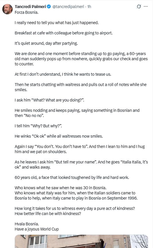 Italijanski novinar Tancredi Palmeri podijelio je na platformi X iskustvo koje ga je, kako sam kaže, duboko dirnulo. Dan nakon noćnog slavlja, u mirnoj atmosferi kafića, zajedno s kolegom završavao je doručak i spremao se da plati račun. A onda – trenutak koji nije mogao predvidjeti.