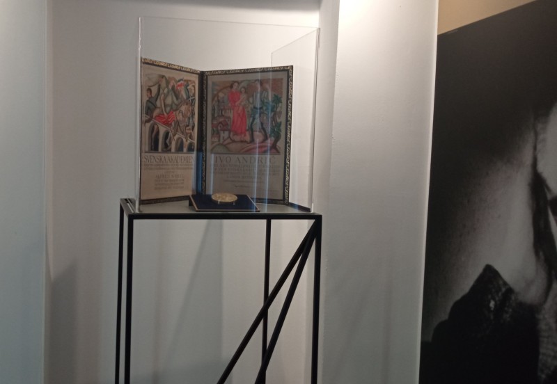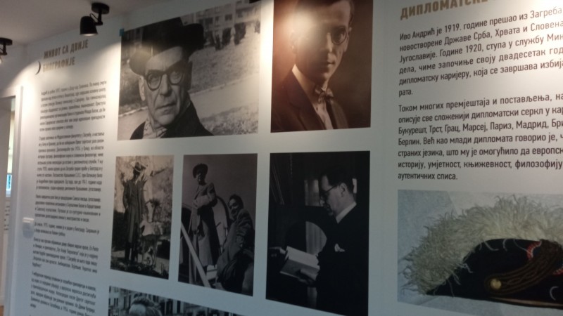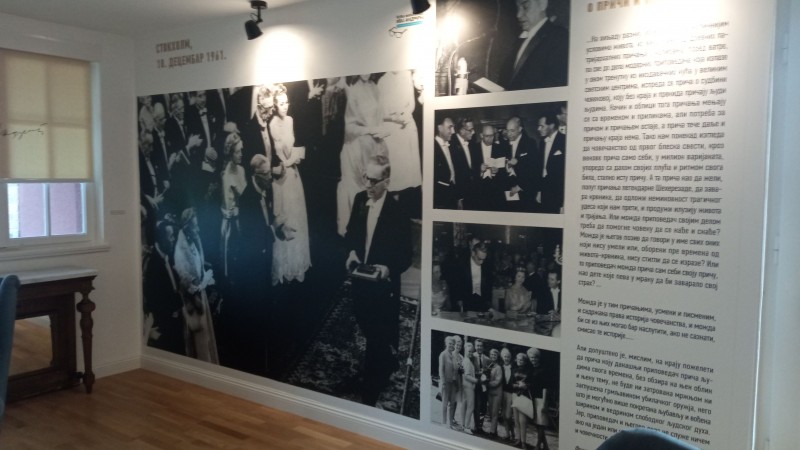 Fotografije na spratu, u biblioteci i kabinetu, predstavljaju Andrića književnika i nobelovca, kao i godine njegove diplomatske karijere. Na zidovima su i njegove druge fotografije, među ostalim i sa dodjele Nobelove nagrade prije 60 godina. Na drugom dijelu zida ispisana je njegova biografija.