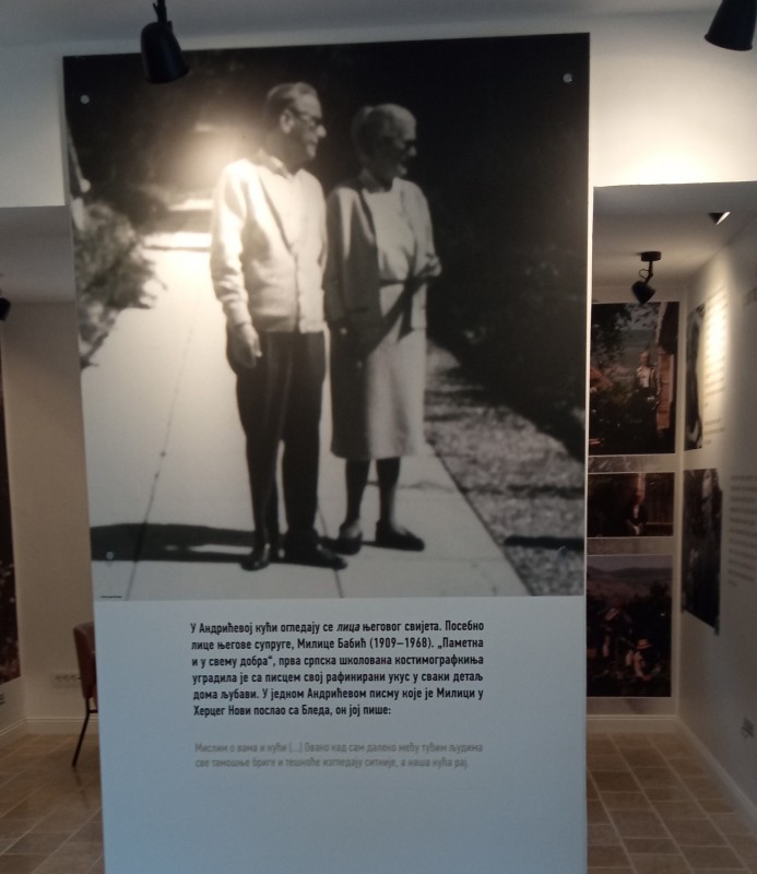 U Andrićevoj kući ogledaju se lica njegovog svijeta. Posebno lice njegove supruge kostimografkinje Milice Babić (1909. – 1968.), koja je ugradila sa piscem svoj rafinirani ukus u svaki detalj tog doma ljubavi. U jednom Andrićevom pismu koje je Milici poslao sa Bleda on joj piše ‘Mislim o Vama u kući… Ovako, kad sam daleko među tuđim ljudima sve tamošnje brige i teškoće izgledaju sitnije, a naša kuća raj’.