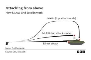 Velika Britanija je također poslala najmanje 3.600 projektila NLAW. Oni su također dizajnirani da eksplodiraju dok prolaze preko relativno izloženog vrha kupole tenkova.