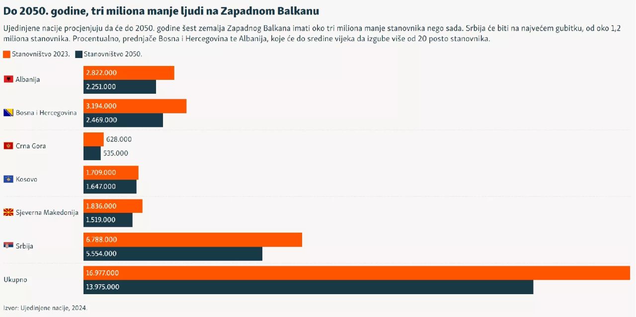 Ujedinjene nacije procjenjuju da će do 2050. godine šest zemalja Zapadnog Balkana imati oko tri miliona stanovnika manje nego što ih imaju sada, prenosi Radio Slobodna Evropa (RSE).