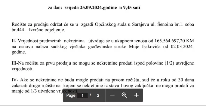 Riječ je o pravnoj stvari u kojoj European Broadcasting Union (EBU) ima potraživanja prema BHRT-u, pa je tako Sud donio zaključak u kojem se određuje prva prodaja nekretnina upisanih u ZK uložak broj 7222 KO SP-Dolac, označen kao parcela vrt, površine 1100 metara kvadratnih, zatim oranica njiva 540 metara kvadratnih, kao i veliku njivu površine 870 metara kvadratnih, 524/1 ekonomsko dvorište, površine 8096 metara kvadratnih benzinska stanica.