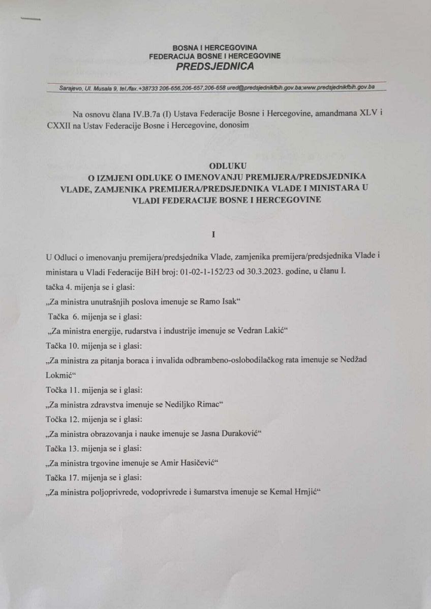 Predsjednica FBiH Lidija Bradara i potpredsjednik FBiH Igor Stojanović potpisali su danas odluku o izmjeni odluke o imenovanju nove Vlade FBiH odnosno saglasnost, a u kojoj se imena ranije predloženih ministara promijenjena.