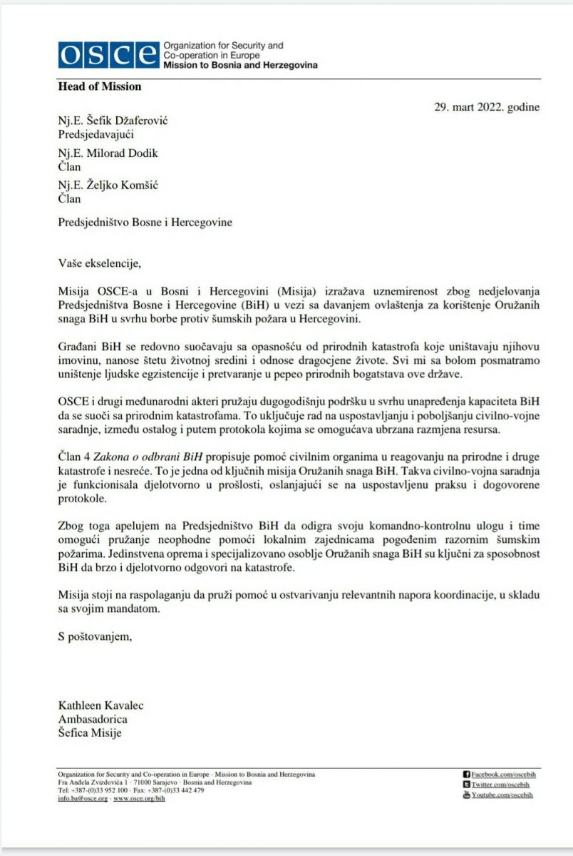 Šefica Misije OSCE-a u Bosni i Hercegovini Kathleen Kavalec, kako saznaje Patria, uputila je oštro intonirano pismo članovima Predsjedništva BiH Šefiku Džaferoviću, Željku Komšiću i Miloradu Dodiku, a povodom izostanka angažmana Oružanih snaga BiH na gašenju požara, za što je potrebna saglasnost sve trojice članova Predsjedništva BiH.
